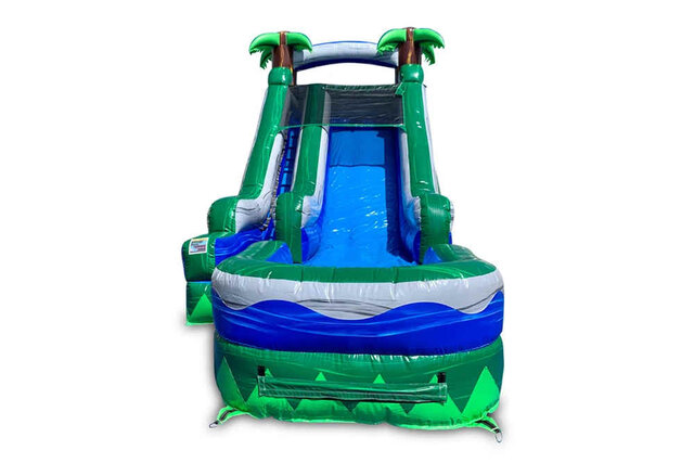 The 15ft Tropical Water Slide delivers a wave of excitement with a vibrant island design, palm tree accents, and a thrilling single-lane slide. At 15 feet tall and 11′ W x 28′ L, it’s perfect for smaller yards, younger riders, and any event looking for a splash of tropical fun.