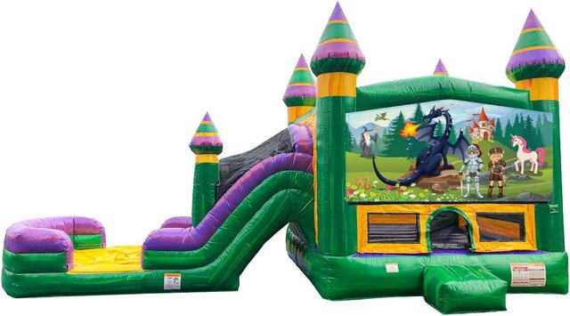 Bring a world of knights, dragons, magic, and medieval adventure to your next celebration with the Dragon Knight Dual Combo Dry! This beautifully themed inflatable features a brave knight, a fearsome fire-breathing dragon, a magical wizard, a castle in the distance, and even a friendly unicorn — the perfect backdrop for fantasy-themed birthdays, school events, church celebrations, and backyard parties.