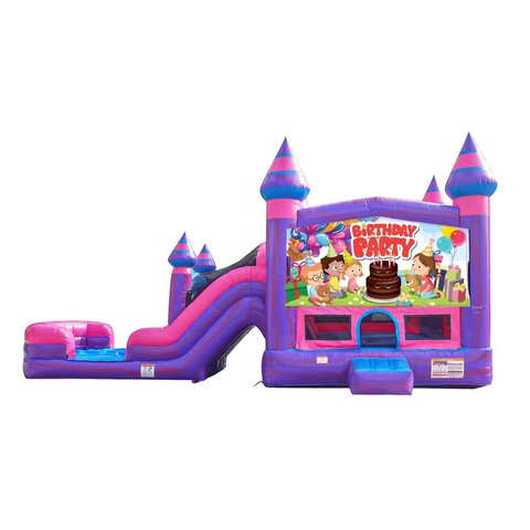 Bring BIG birthday energy to your event with the Happy Birthday Dual Combo Wet, the perfect inflatable for splash-filled celebrations! This vibrant birthday-themed combo features a bouncing area, climbing wall, built-in basketball hoop, and an exciting dual-lane water slide that ends in a refreshing splash zone—making it a must-have for hot summer birthdays.